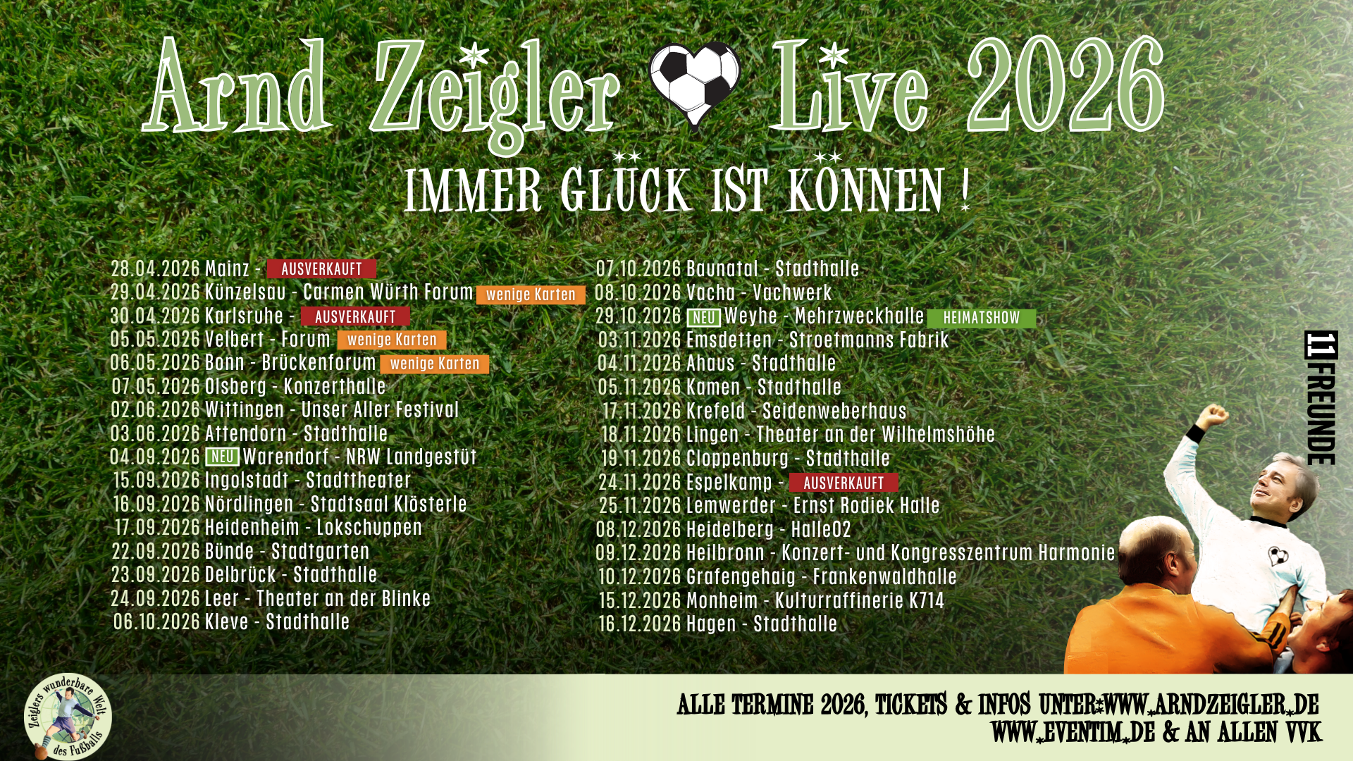 Fußball-Freunde aufgepasst: Arnd Zeigler ist seit September 2024 mit seinem dritten Bühnenprogramm „Immer Glück ist Können!“ auf Tour. Der Titel ist Programm, denn nach über 250 Live-Auftritten kann man mit Fug und Recht behaupten: Das ist nicht nur Glück – da muss auch Können im Spiel sein. Wer die Fernsehsendung „Zeigler wunderbare Welt des Fußballs“ kennt, der weiß, was man von dem Live-Pendant erwarten kann. Kernige Typen, kultige Sprüche und Kacktore en masse – eine Komposition von und für den Fußball. Erklärtes Ziel bleibt es, der Faszination Fußball auf den Grund zu gehen. Gar nicht so einfach, denn die Kommerzialisierung wird immer größer, das Regelwerk immer undurchsichtiger und am Ende gewinnen die Bayern. Doch mit dem Fußball ist es wie mit Darth Vader: Es steckt noch viel Gutes in ihm. Wir dürfen uns auf eine weitere Runde pickpackevoller Fußballabende mit großen Emotionen freuen.